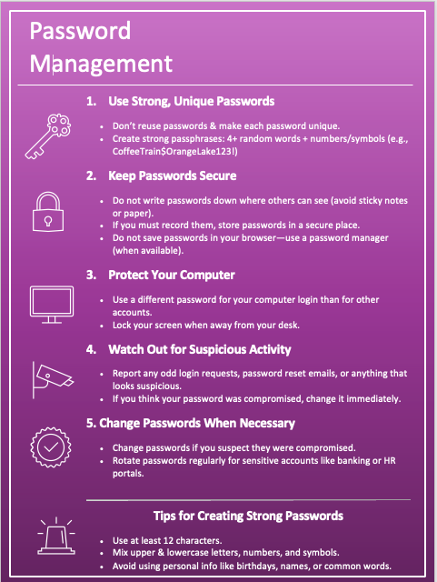 - Strong Password Rules: Quick reference for creating secure passwords in a clear, one-page format.(e.g. 12+ characters, mix of letters, numbers, and symbols).