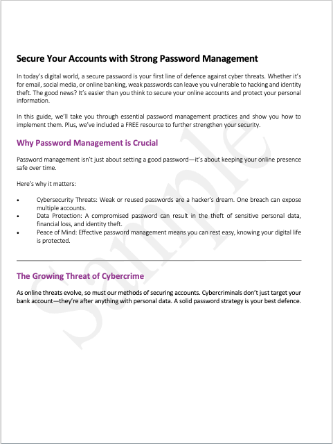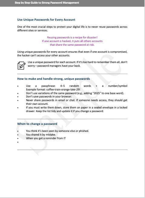 - Unique Passwords: Guidance on why every account must have its own password and how password managers can help.