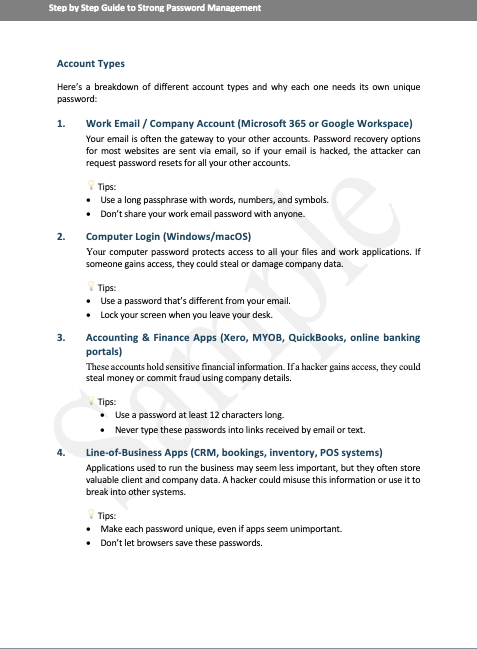 Weak passwords are one of the biggest risks to protecting your business’s data. This procedure gives you a clear, practical framework to create, manage, and maintain secure passwords across all your work accounts.